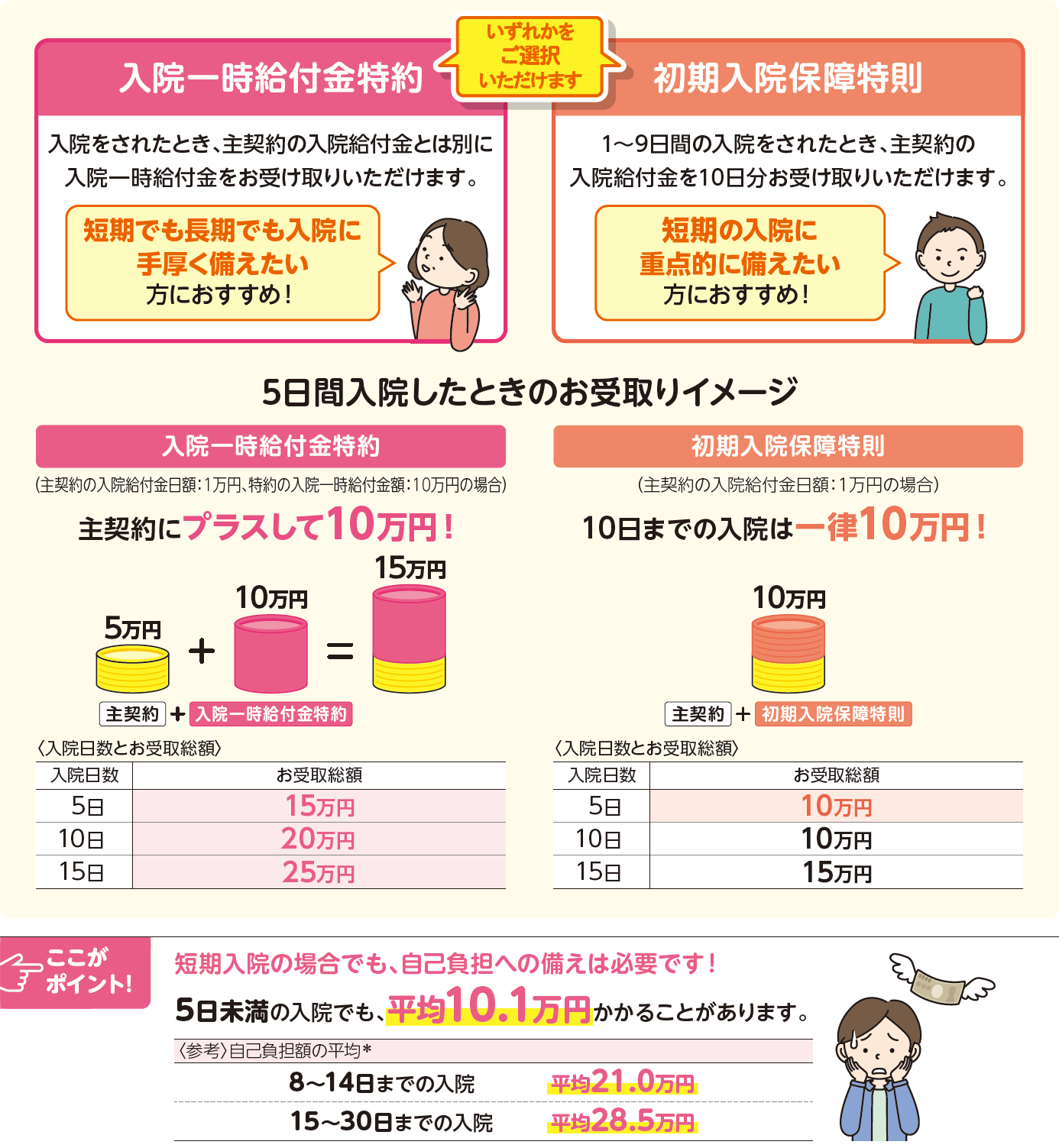 選べる2つのオプション(初期入院保障特則/入院一時給付金特約)で、短期入院でもまとまった金額をお受け取りいただけます。